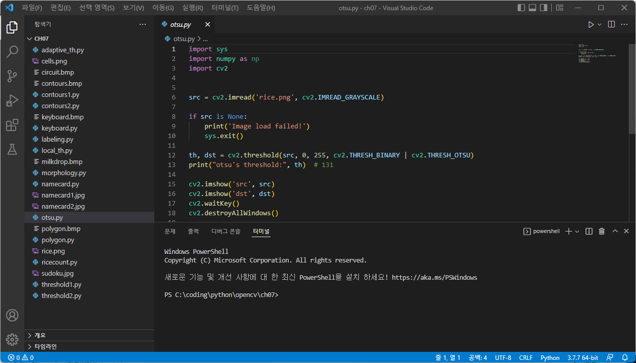 * threshold 인자 중 Type 부분에서 cv2.THRESH_BINARY | cv2.THRESH_OTSU 처럼 사용해도 좋지만 일반적으로 cv2.THRESH_OTSU 만 사용해도 무방하다.