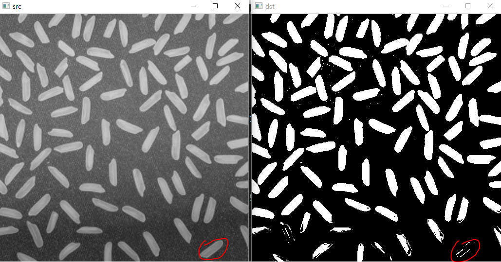영상 하단 부분은 평균보다 어둡기때문에 쌀알이 잘 표현되지 않는 듯한 모습을 볼 수 있다.