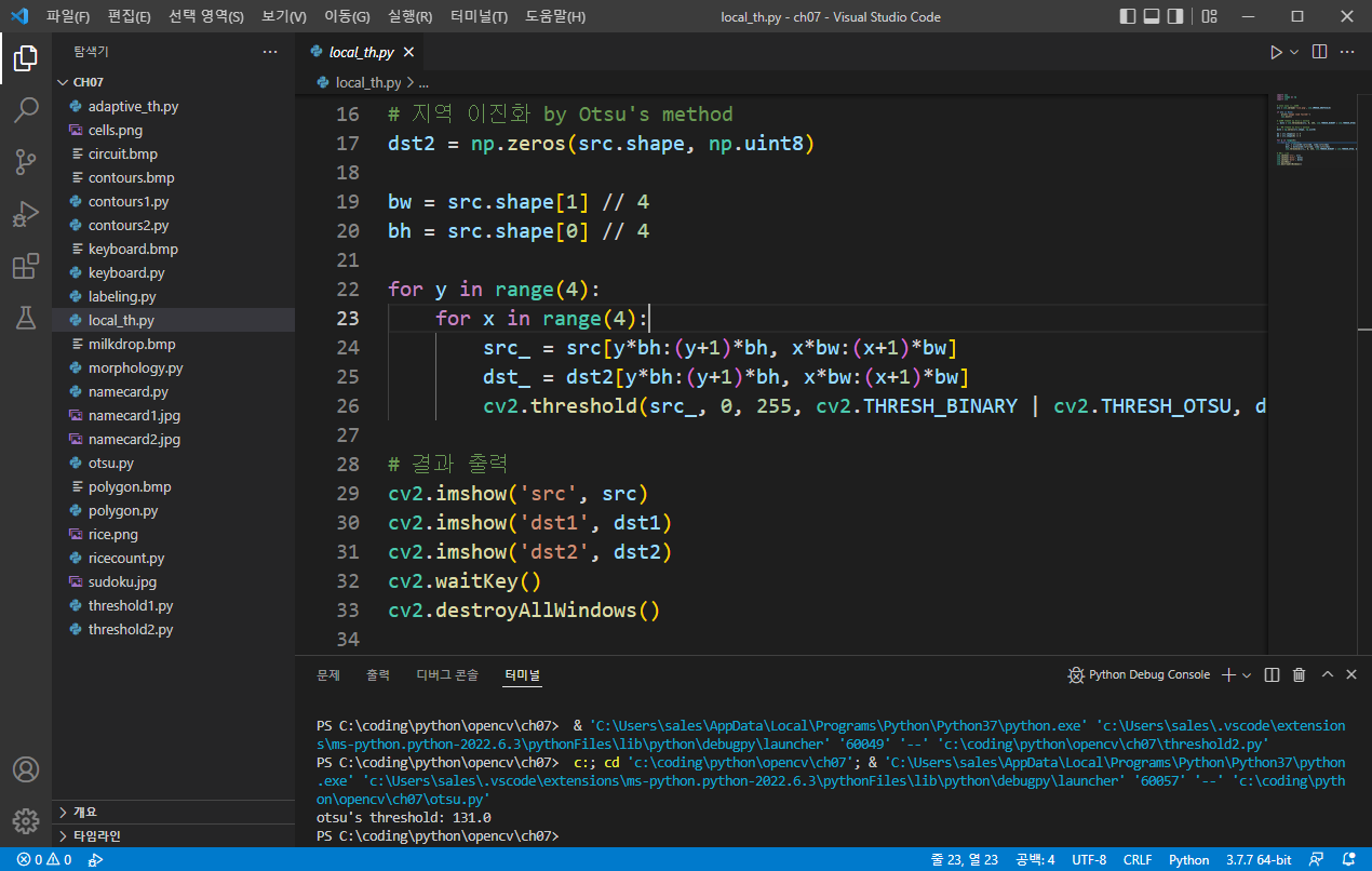 * 위 방법은 전에 설명한 지역이진화 방법보다 연산이 느리다.