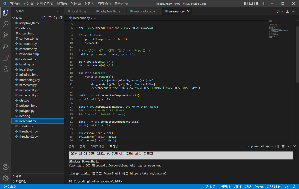 | [Open CV] 이진 영상 처리 _ 모폴로지 _ 지역 이진화 (0) | 2022.06.06 |