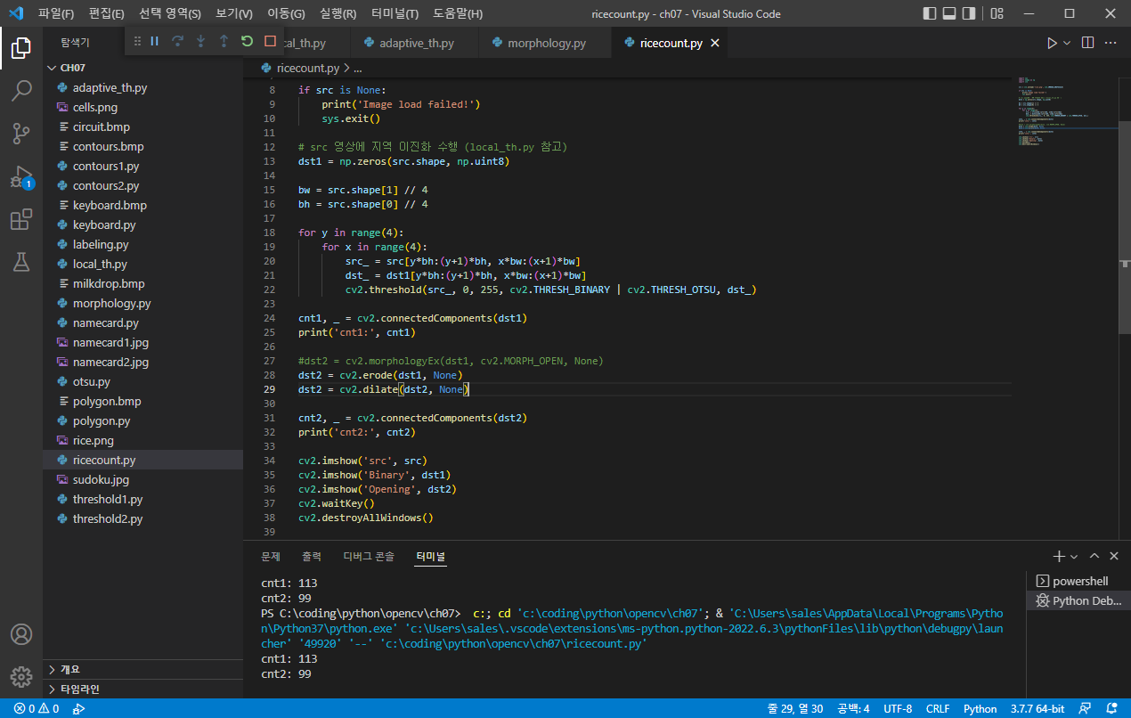 그리고 금일 배운 MORPH_OPEN 인자를 사용하여 열기 연산을 해준 뒤 다시 객체들의 갯수를 리턴 받는다.실제 Run을 시켜보면 다음과 같은 결과를 얻을 수 있다.