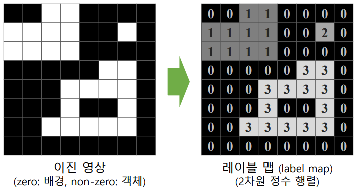 - 서로 연결되어 있는 객체 픽셀에 고유한 번호를 지정 ( 레이블 맵 )