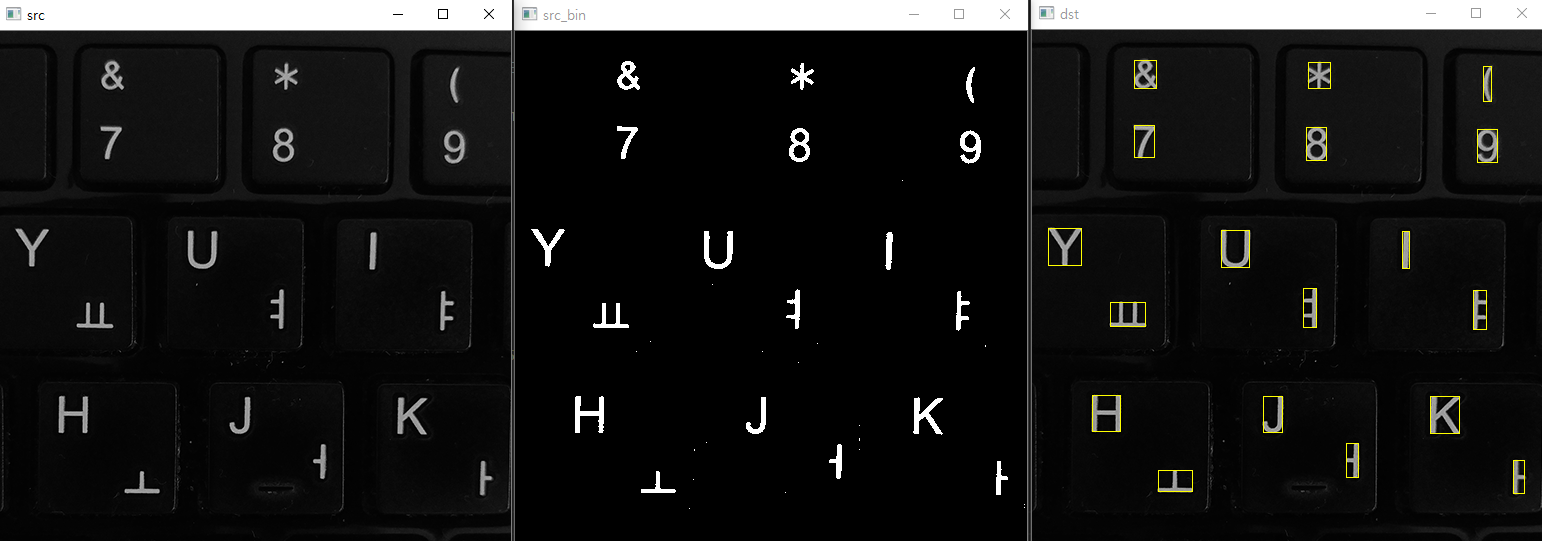 키보드 이미지를 활용하여 객체를 찾아내 빨간 박스를 그리는 작업의 코딩이다.여기서 중요한 점은 x, y , w , h , area 의 정보를 한번에 추출하여 사용할 수 있다는 점과노이즈들을 제거하는 함수를 사용하지 않고 area 가 20픽셀보다 작으면 걸러낼 수 있어좀 더 효과적으로 사용할 수 있다는 것이다.실제 실행시켜 보게되면