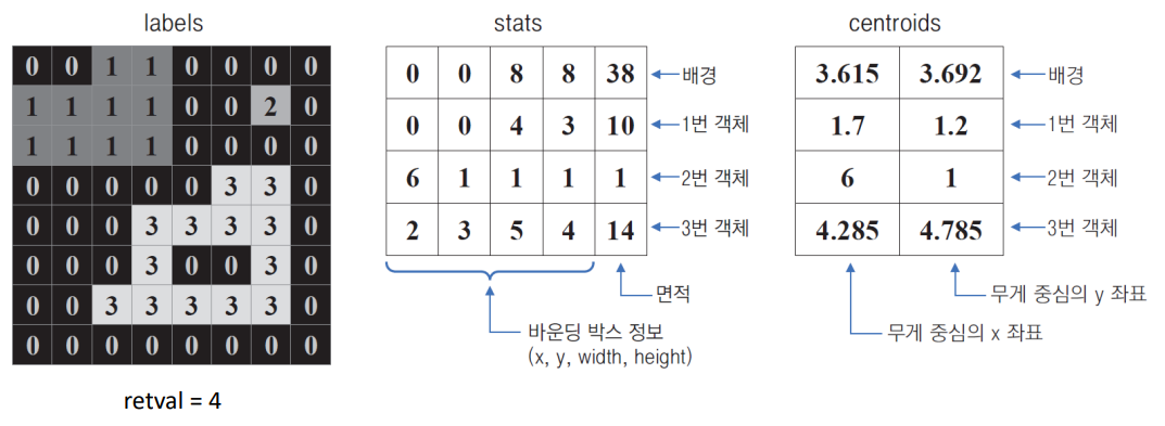 retval : 객체 개수. N을 반환하면 [ 0, N-1] 의 레이블이 존재 하며, 0은 배경을 의미. ( 실제 흰색 객체 개수는 N-1개 )