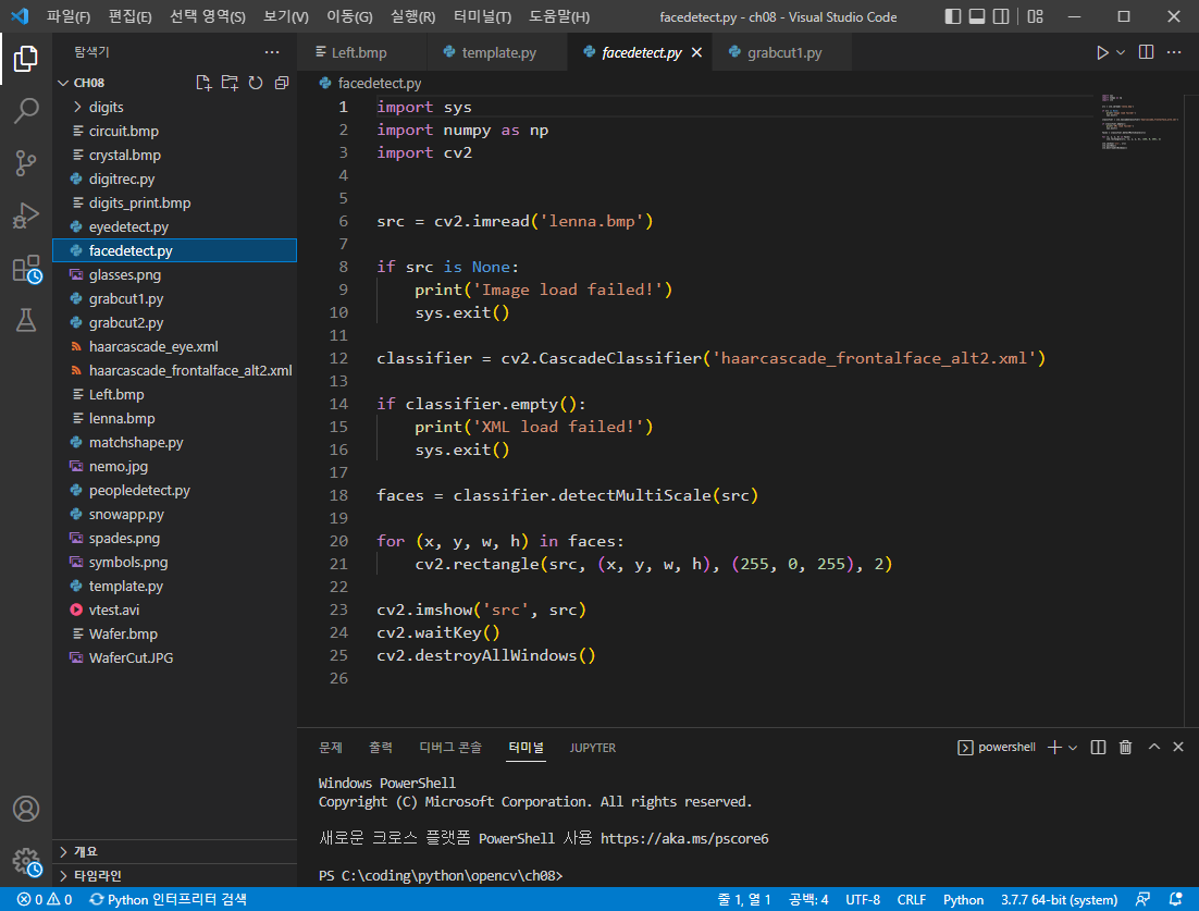 그리고 faces 변수에 detectMultiScale 함수를 사용해서 실제 얼굴이 검출된 바운딩 박스정보를 입력해준다.