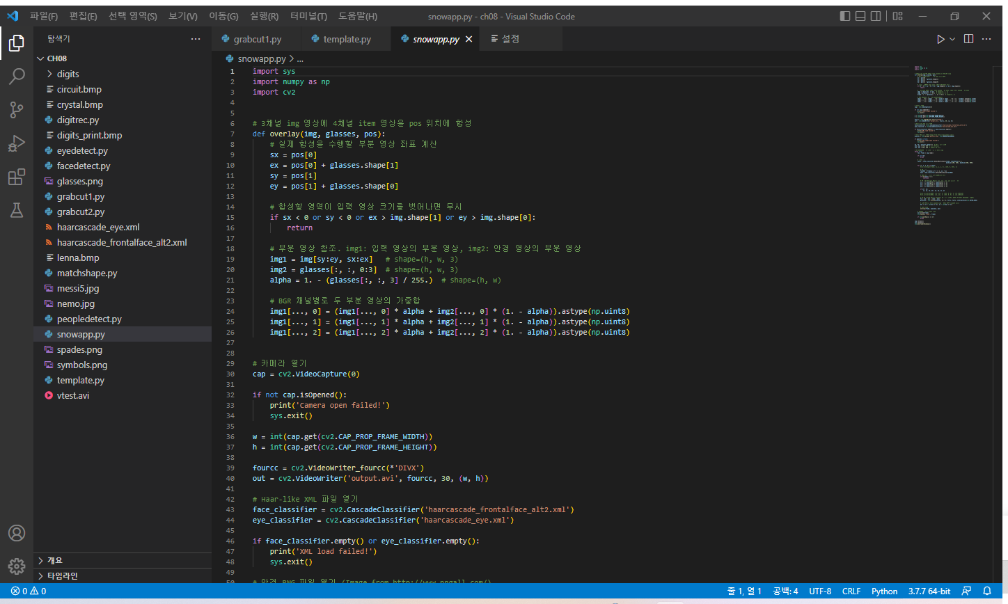 - 카메라 입력 영상에서 얼굴을 검출하여 재미있는 그래픽을 합성하는 프로그램