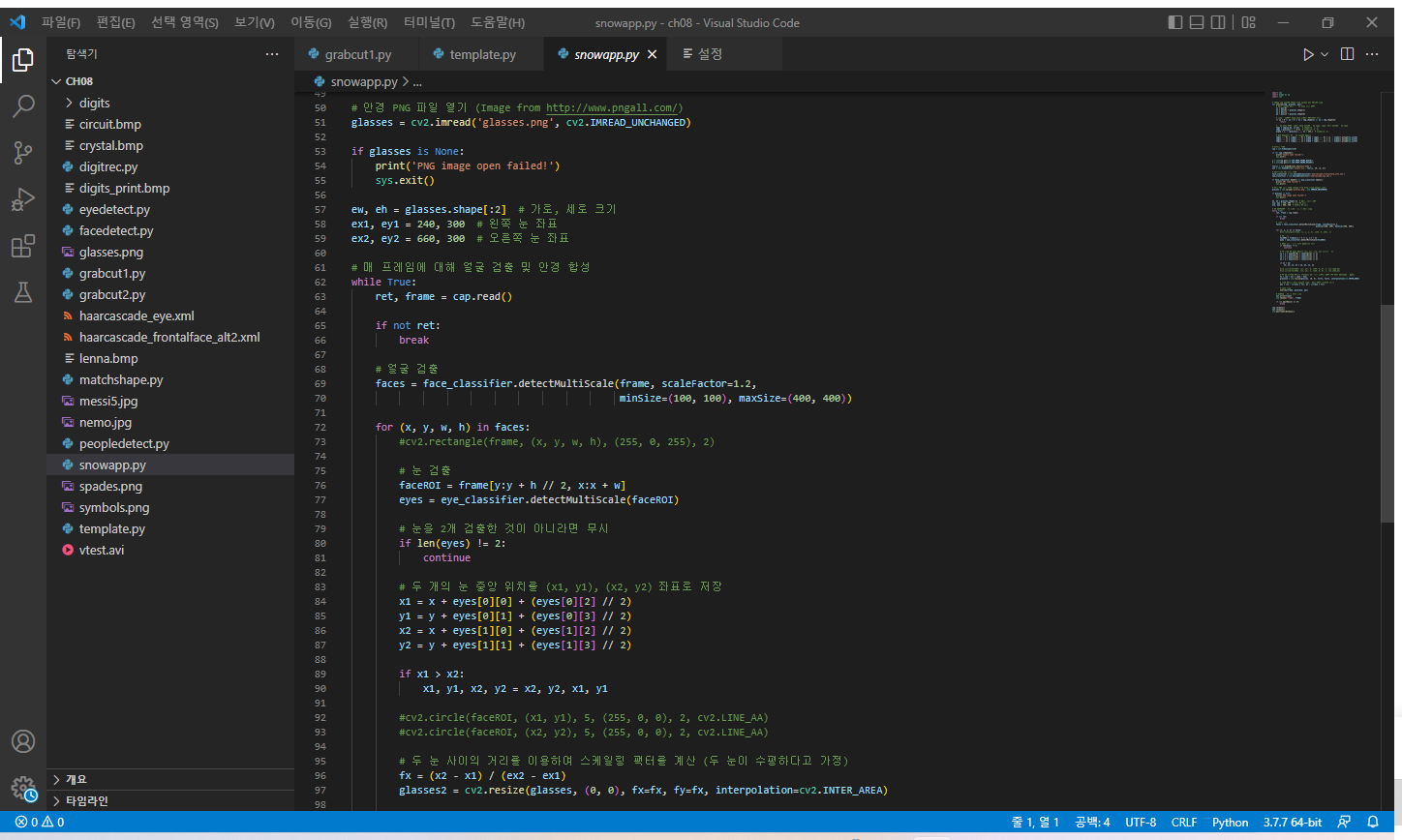 - 카메라 입력 영상에서 얼굴&눈 검출하기