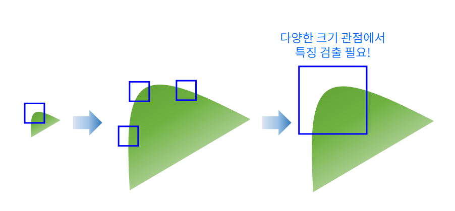 작은 객체를 봤을때는 코너처럼 보이기는 하지만 크기를 키우거나 확대하면 엣지로 보일 수 있다.그래서 다양한 크기 관점에서 특징 검출이 필요하다. * 특징점(feature point) = 키포인트(keypoint) = 관심점(interest point)