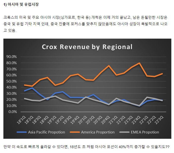 #크록스 #CROX #CROCS #중국CROCS 네이버 블로그 https://blog.naver.com/passion4806/222932418326 크록스 ( CROX ) _ 기업분석 (3) #크록스 #CROX #CROCS #중국CROCS 아시아시장 분석 https://blog.naver.com/passion4806/222... blog.naver.com 아시아시장 분석 https://blog.naver.com/passion4806/222922769349 크록스 ( CROX ) _ 기업분석 (2) #크록스 #크록스분석 #크록스기업분석 #크록스실적 #CROX #CROCS 크록스 헤이듀드 인수 이유 스터... blog.naver.com 이 전 블로그 글에서 분석했다싶이 최근 크록스는 아시아 시장에 대한 매출..